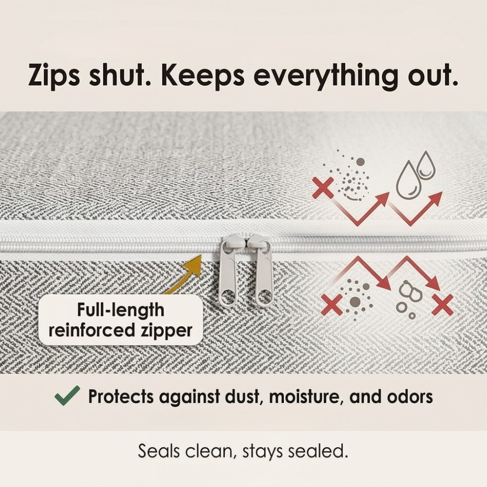 The zippered lid seals the entire top, keeping dust, moisture, and pests out. For long-term seasonal storage, it works well in closets, attics, or garage shelving.